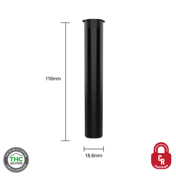 Child resistant pre roll tubes are an easy, convenient, and safe solution for packaging pre-rolls. The odor-tight seal significantly decreases odor to ensure secure storage and privacy. The 116mm tubes are sized for blunts or extended length pre-rolls, such as king sized cones, and vape cartridges.